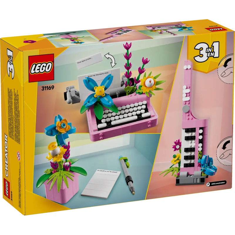 LEGO Fans können 3 verschiedene Modelle mit Blumen bauen: eine Schreibmaschine mit Blumen, eine Keytar auf einem Ständer mit Blumen oder einen Blumentopf mit Notizblock und Stift. Zu dem vielseitig umgestaltbaren Spielset gehören auch 3 Aufkleber mit geistreichen Botschaften, mit denen Kinder ihre Modelle aus LEGO Steinen verzieren können.