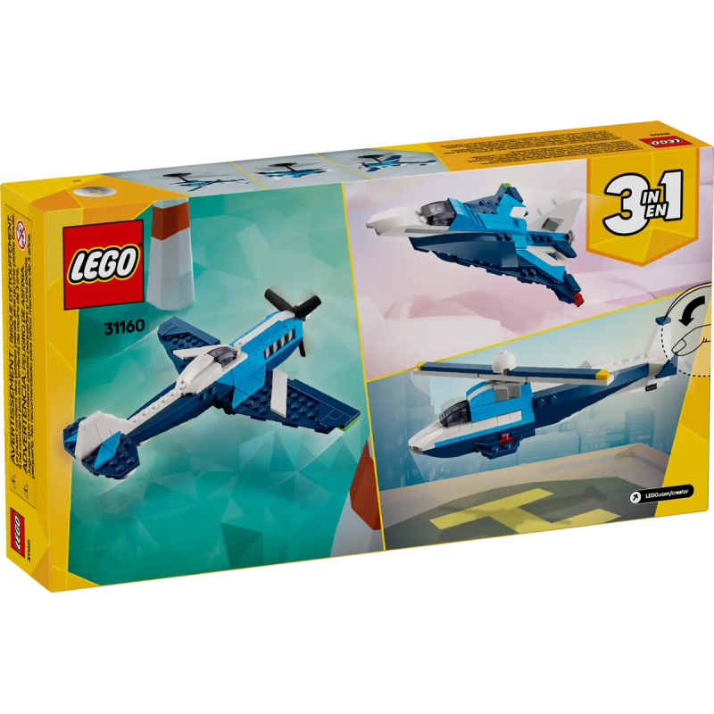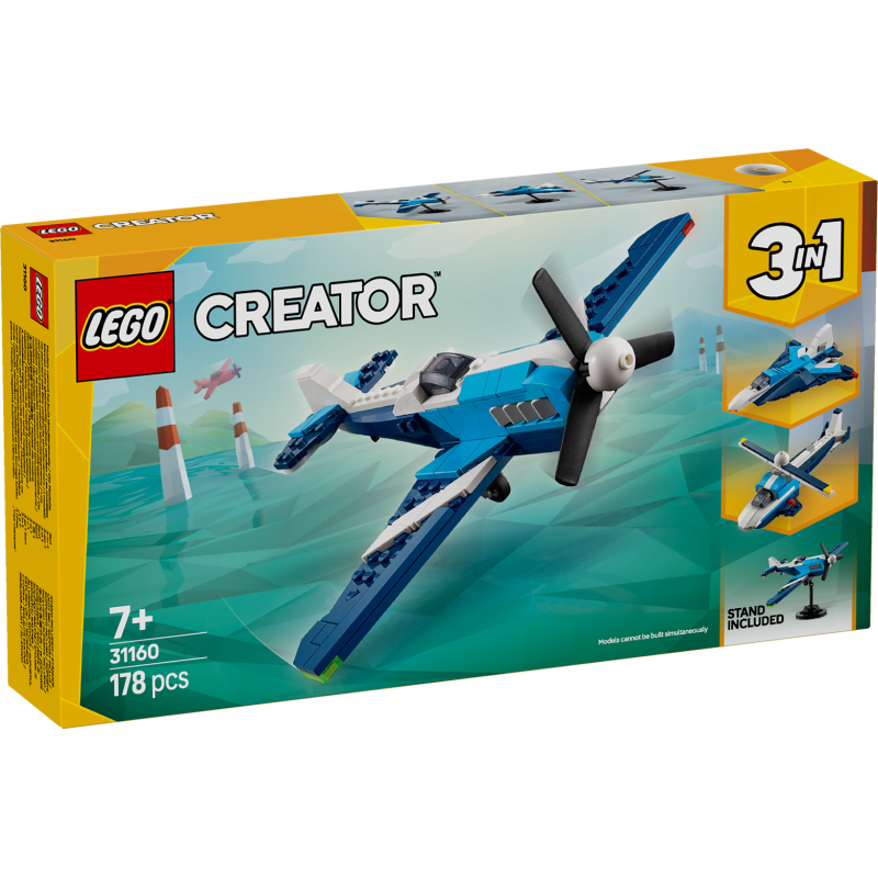 LEGO® Creator Flieger: Rennflugzeug (31160) ist ein 3-in-1-Spielset, das Jungen und Mädchen ab 7 Jahren zu rasanten Abenteuern abheben lässt. Das Rennflugzeug hat vorne einen drehenden Propeller, bewegliche Räder, damit es am Boden fahren kann, sowie einen Ständer aus LEGO Steinen zum Ausstellen.