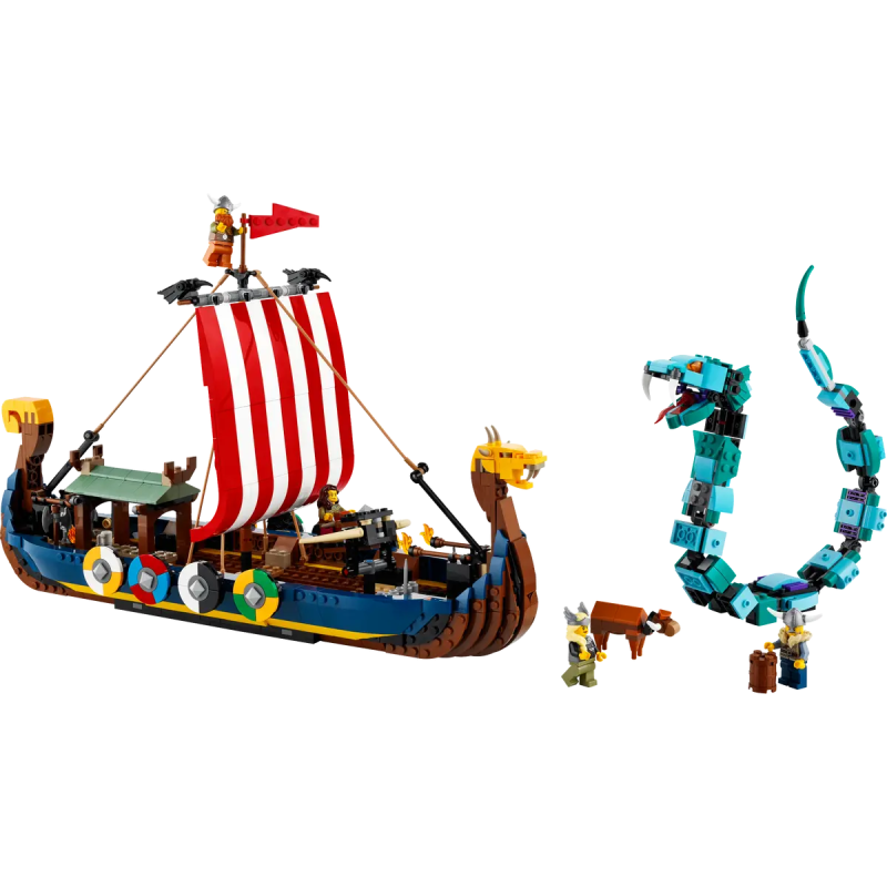Das LEGO® Creator 3-in-1-Set „Wikingerschiff mit Midgardschlange“ (31132) lädt Kinder ab 9 Jahren zu spannenden Rollenspielen ein. Das Bauset beinhaltet das Modell eines Wikingerschiffs mit 8 Schilden und einer Balliste sowie einer Kuh und 2 Raben aus LEGO Steinen sowie eine bewegliche Midgardschlange für packende Abenteuer.