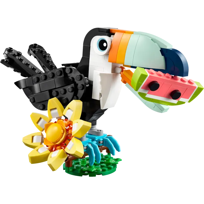 LEGO® Creator Wilde Tiere: Tropischer Tukan (31173) ist ein 3-in-1-Spielset für jede Menge Spielspass in den Tropen. Der LEGO Spielzeugvogel sitzt auf einem Ast, der von einer großen Blume aus LEGO Steinen bedeckt wird, und pickt in ein Stück Wassermelone. Für ein noch faszinierenderes Spielerlebnis kann der Vogel die Flügel, den Schnabel und die Schwanzfedern bewegen.