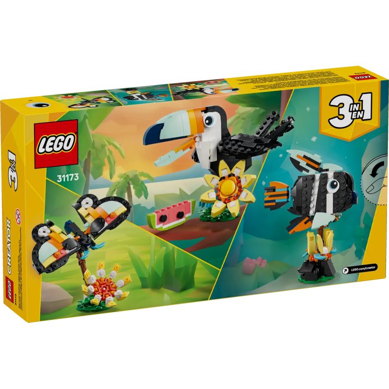 Das LEGO Bau- und Spielset lässt Kindern die Wahl, welches dieser 3 Tiere sie mit denselben LEGO Steinen bauen: einen beweglichen Spielzeugtukan, dem man ein Stück Wassermelone in den Schnabel stecken kann, einen bunten Schmetterling, der über einen Streifen Grasland mit Blumensäule fliegt, oder einen Tropenfisch mit beweglichen Flossen, der sich auf seinem Meeresgrundsockel um 360 Grad drehen kann.