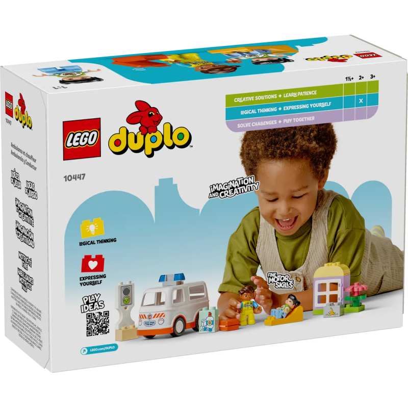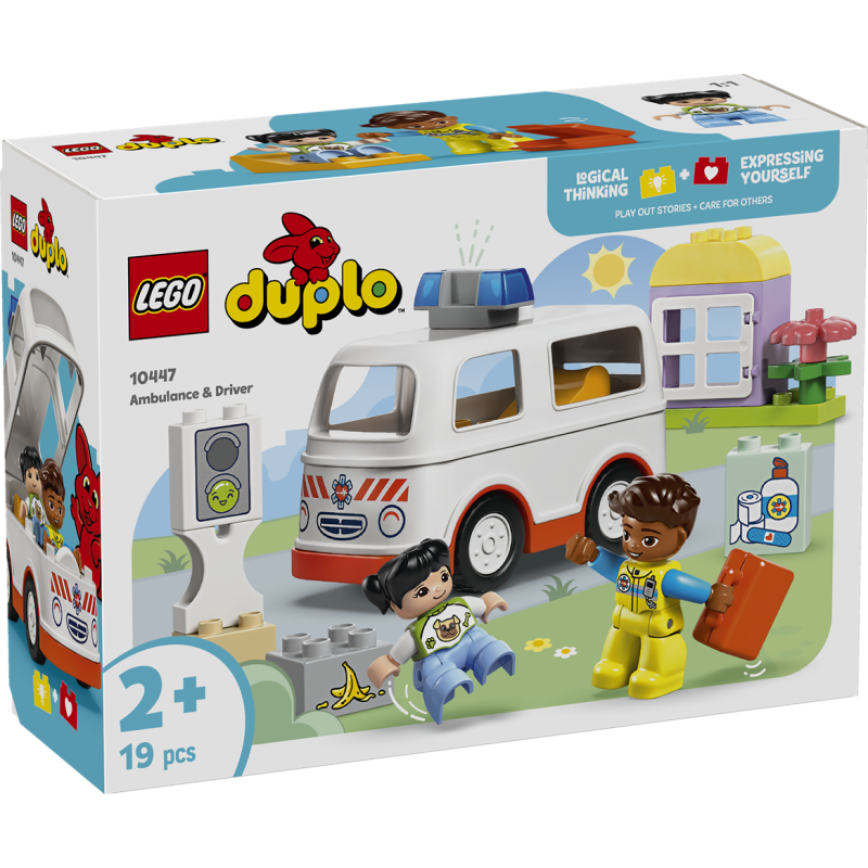 Rettungswagen mit Fahrer (10447) ist ein Spielzeug, mit dem Kleinkinder spannende Rettungseinsätze darstellen können. Das Set beinhaltet einen fahrbaren Spielzeugrettungswagen und 2 LEGO® DUPLO® Figuren. Ein Rettungssanitäter und ein Mädchen ladenzu kreativen Rollenspielen ein.