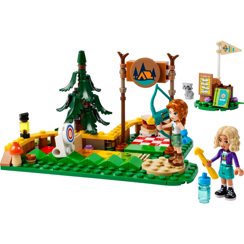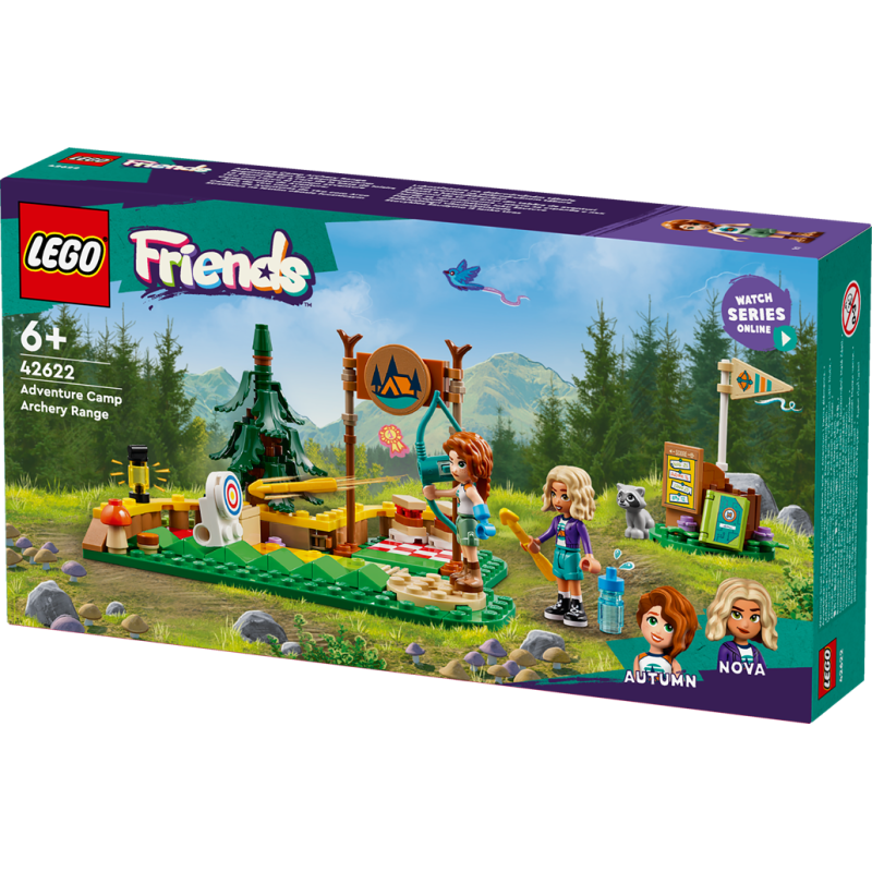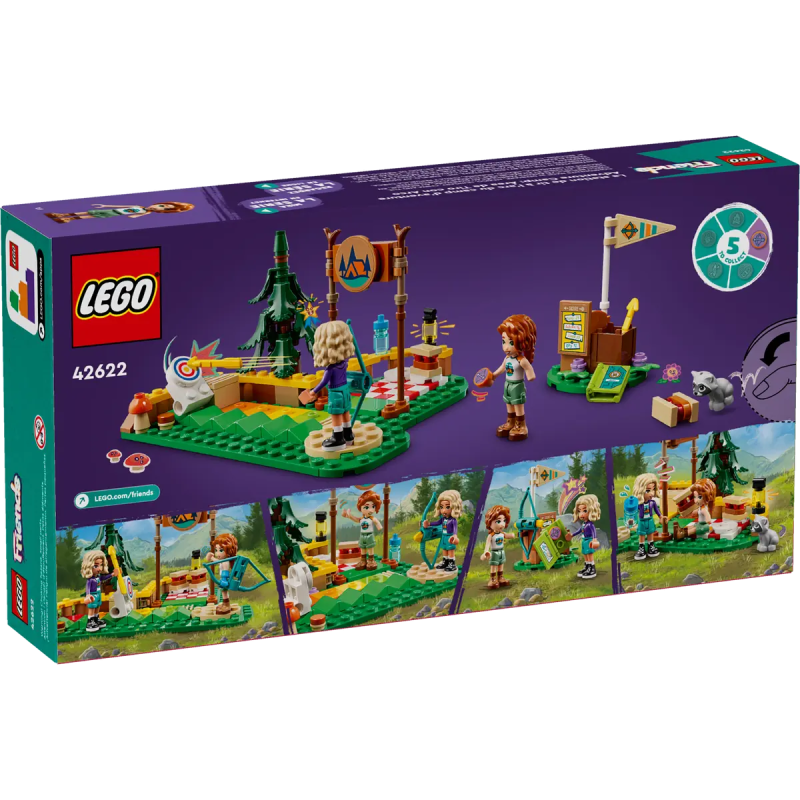 LEGO® Friends Bogenschiessen im Abenteuercamp (42622) ist ein Bauspielzeug für Kinder ab 6 Jahren. Das Set beinhaltet die Spielfiguren Autumn und Nova, einen Waschbären und jede Menge Sportzubehör. Mädchen und Jungen können so tun, als würden sie das Zielen üben. Der Bogen verschiesst tatsächlich Pfeile. Wenn das Ziel vom Pfeil getroffen wird, klappt es nach unten. Es gibt eine farblich markierte Schwierigkeitsskala. Je weiter entfernt die Kinder das Ziel aufstellen, desto schwieriger wird die Aufgabe.