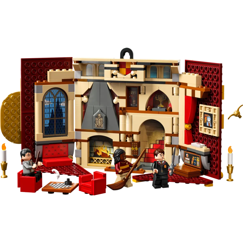 - Authentische Details: Das Banner zeigt das Gryffindor™ Hauswappen und lässt sich aufklappen, um den Gemeinschaftsraum aus LEGO® Steinen preiszugeben, der mit einem Kamin, Stühlen und Kerzen sowie einem Schachbrett eingerichtet ist