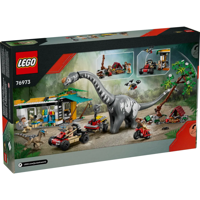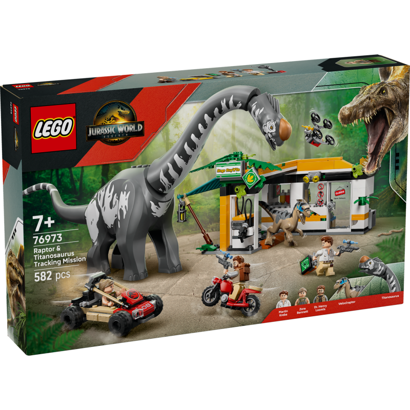 LEGO® Jurassic World Raptor & Titanosaurus: Grosse Fährtensuche (76973) ist ein Bauset, in dem Kinder und Filmfans ab 7 Jahren spannende Verfolgungsjagden und jede Menge Actionspass erwarten. Zu diesem Geschenk für Jungen und Mädchen gehören 2 gegossene Spielzeugdinos – ein Titanosaurus und ein Velociraptor – sowie 3 Minifiguren: Zora Bennett, Martin Krebs und Dr. Henry Loomis. Der Velociraptor kann sein Maul aufklappen, und der Titanosaurus kann Hals, Kopf und Schwanz bewegen. Das interaktive Spielset beinhaltet außerdem eine Tankstelle, einen Geländewagen mit Anhänger, einen Spritzenkoffer mit 3 Spritzen, ein Motorrad, eine baubare Drohne und einen Campbereich mit einer Funktion, die einen Baum umstürzen lässt.