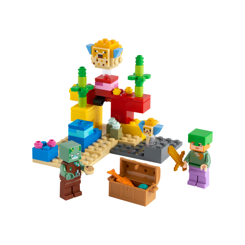 Minecraft™, das beliebte Onlinespiel für Kinder, wird mit dem LEGO® Minecraft™ Spielset „Das Korallenriff“ (21164) zu einem aktiven Spielerlebnis. Dank der immer wieder neu zusammensteckbaren LEGO Steine nimmt das kreative Bauvergnügen kein Ende. Es lassen sich Unterwasserabenteuer mit authentischer Minecraft™ Action nachstellen. Kinder begleiten Alex, die beliebte Minecraft™ Heldin, in die Tiefen des Minecraft™ Ozeans, um in dem farbenfrohen Korallenriff nach einem verborgenen Schatz zu suchen. Fantasievolle Minecraft Elemente wie die vorbeischwimmenden Kugelfische und die überraschend auftauchende Schatzkiste gehören auch zum Set. Es gibt auch einen spannenden Schwertkampf mit einem Ertrunkenen, denn Begegnungen mit einem Zombie dürfen in keinem Minecraft™ Abenteuer fehlen.
