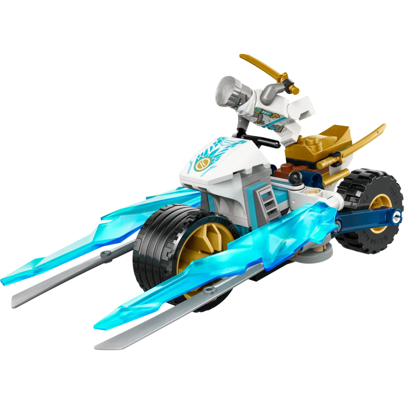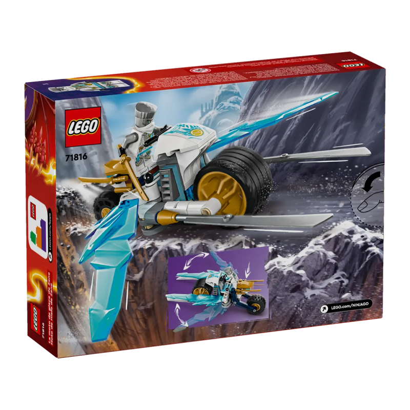 LEGO® NINJAGO® Zanes Eismotorrad (71816) lässt Jungen und Mädchen ab 7 Jahren rasante Actionszenen aus der 2. Staffel der TV-Serie NINJAGO Aufstieg der Drachen nachstellen. Dieses Ninja-Spielzeug für Kinder beinhaltet ein NINJAGO Motorrad mit drehenden Rädern, goldenen Klingen und Hinterradfederung. Wenn Kinder das Hinterrad hinunterdrücken, werden an beiden Seiten coole Eisklingen für den Angriffsmodus ausgeklappt. Dieses imposante Abenteuer-Spielset beinhaltet die Minifigur Zane, die man aufs Motorrad setzen kann. Zane trägt seine brandneue Turnierrüstung und schwingt bei vielen spannenden Actionrollenspiele in der NINJAGO Welt seine beiden Katanas. In dem breiten Angebot an LEGO NINJAGO Bausets finden Ninja-Fans weitere Mechs, Drachenund Tempel für spannende Actionrollenspiele. Jedes dieser Ninja-Spielsets kann auch mithilfe der LEGO Builder App gebaut werden, die dich und dein Kind auf ein ebenso einfaches wie intuitives Bauabenteuer mitnimmt.