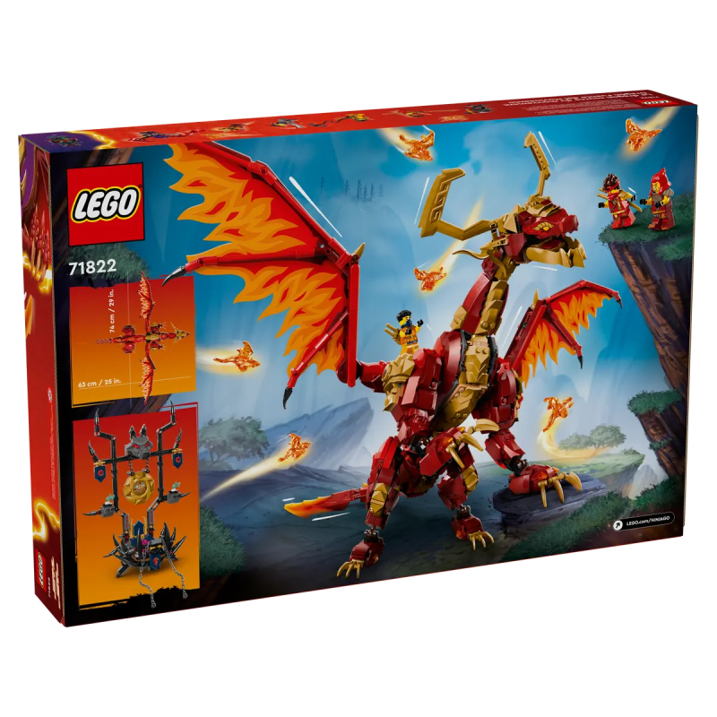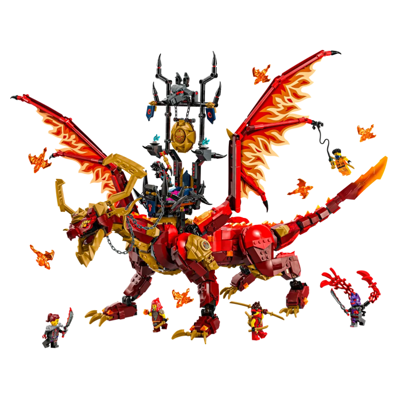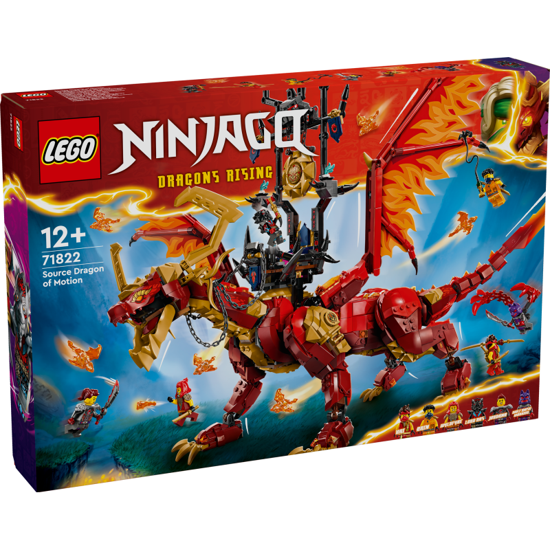Der Quelldrache der Bewegung (71822) ist ein Abenteuerset, mit dem Kinder ab 12 Jahren die spannenden Abenteuer aus der 2. Staffel der TV-Serie NINJAGO® Aufstieg der Drachen nachstellen können. Dieser bisher größte LEGO® Spielzeugdrache kann Beine, Schwanz, Hüften, Kiefer, Kopf, Hals und Flügel bewegen. Er trägt einen Sattelthron auf dem Rücken. Zum Set gehören außerdem 6 kleinere Geisterdrachen.