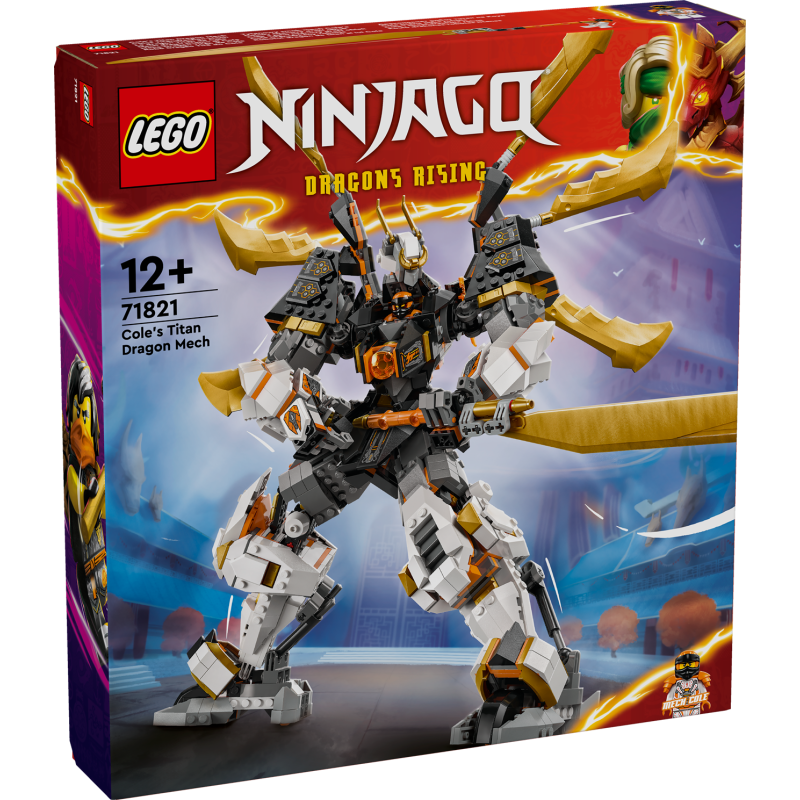 Coles Titandrachen-Mech (71821) ist ein Actionspielzeug, das Jungen und Mädchen ab 12 Jahren Actionszenen aus der 2. Staffel der TV-Serie NINJAGO® Aufstieg der Drachen nachstellen lässt. Dieser bisher größte NINJAGO Mech kann Arme, Beine, Kopf, Rumpf, Flügel und Gelenke bewegen, damit Kinder ihn in coole Actionposen bringen können. Außerdem schwingt er ein großes Schwert.