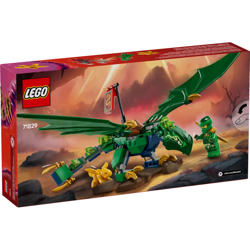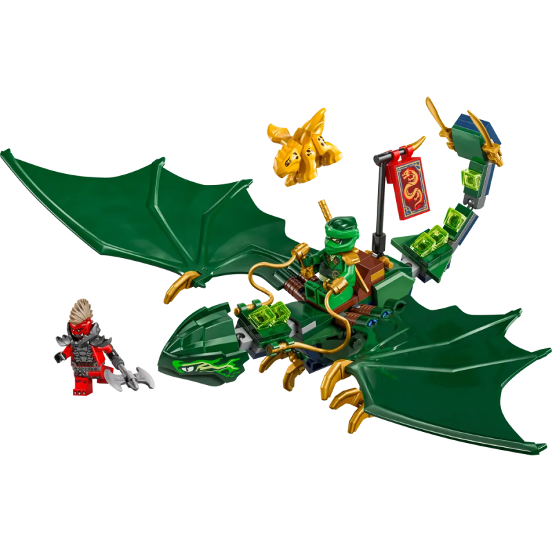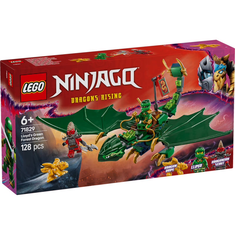 Lloyds grüner Walddrache (71829) ist ein Bau- und Spielset, mit dem Jungen und Mädchen ab 6 Jahren packende Actionszenen in der Luft aus der 3. Staffel der TV-Serie NINJAGO® Aufstieg der Drachen nachstellen können. Das Set beinhaltet einen imposanten Spielzeugdrachen, der Schwanz, Hals, Beine, Flügel und Hände bewegen kann. Der Drache trägt einen Sattel auf dem Rücken, damit eine Minifigur auf ihm reiten kann.