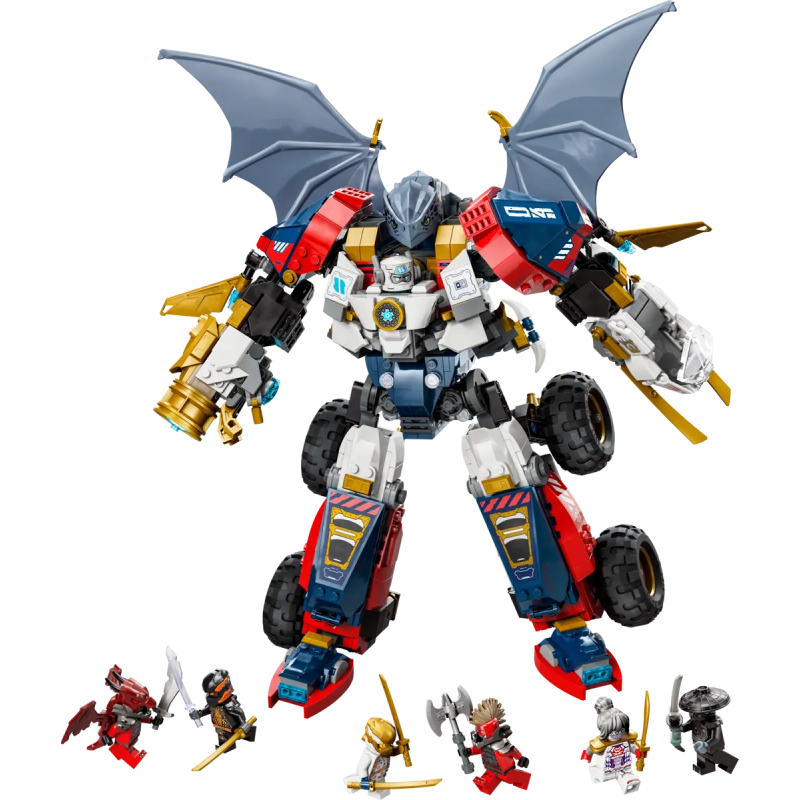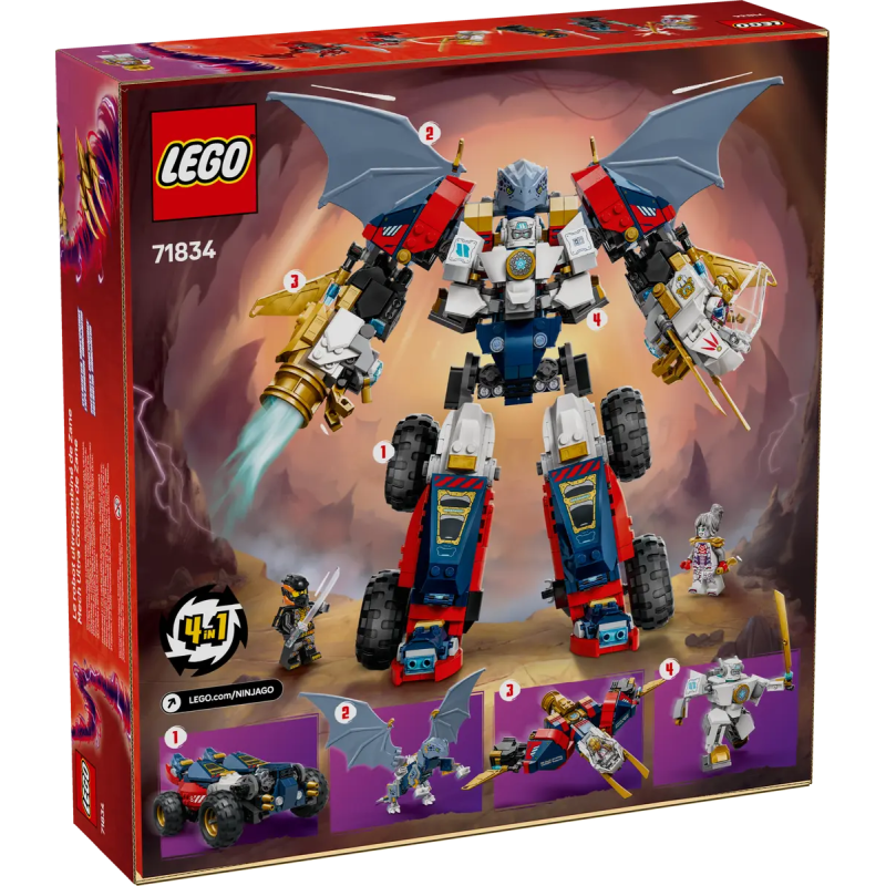Zanes Ultra-Kombi-Mech (71834) ist ein 4-in-1-Bauset, das Jungen und Mädchen ab 9 Jahren unzählige Spielmöglichkeiten bietet und Fans packende Actionszenen aus der 3. Staffel der TV-Serie NINJAGO® Aufstieg der Drachen nachstellen lässt.