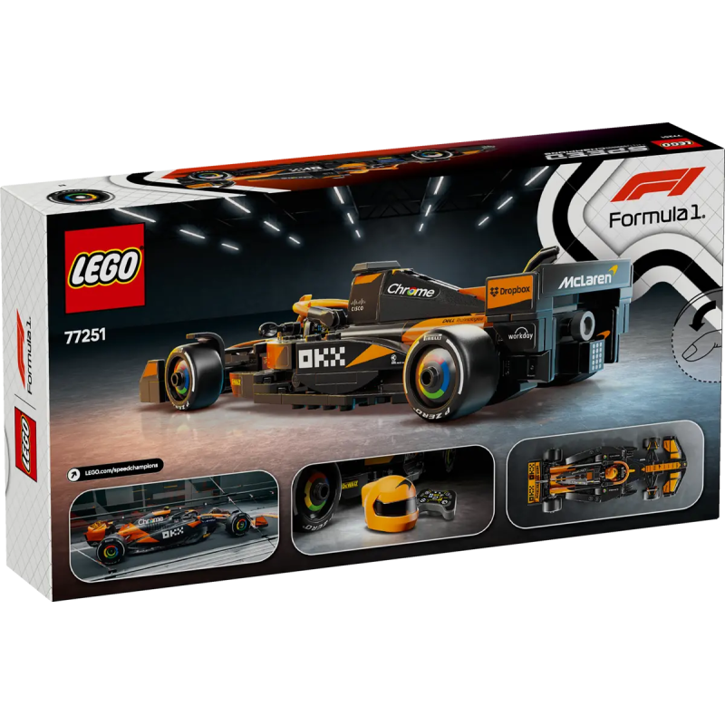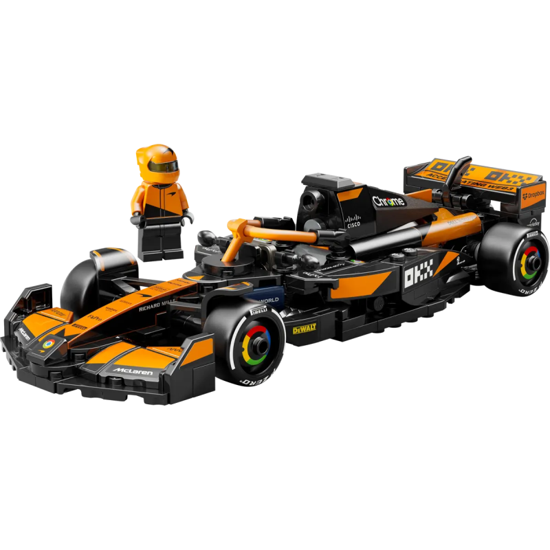 Das Modell des F1-Rennautos hat ein Cockpit, das sich mithilfe eines Halo-Bügels hochklappen lässt, einen Heckflügel, einen Querlenker, Sponsorenaufkleber und breitere Hinterreifen mit dem Aufdruck „Pirelli“. Zum Rennauto gehört auch eine Rennfahrer-Minifigur mit Helm im McLaren-Rennoverall, die ins Cockpit gesetzt werden kann.