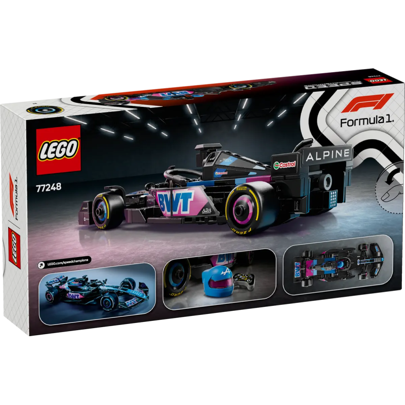 Das Modell des F1-Rennautos hat ein Cockpit, das sich öffnen lässt, indem man den Halo-Bügel hochklappt, einen Heckflügel, einen Querlenker, Sponsorenaufkleber und breitere Hinterreifen mit dem Aufdruck „Pirelli“. Zu dem F1-Rennauto gehört auch eine Rennfahrer-Minifigur im Alpine-Rennoverall und mit Rennhelm, die man fürs Rennen ins Cockpit setzen kann.
