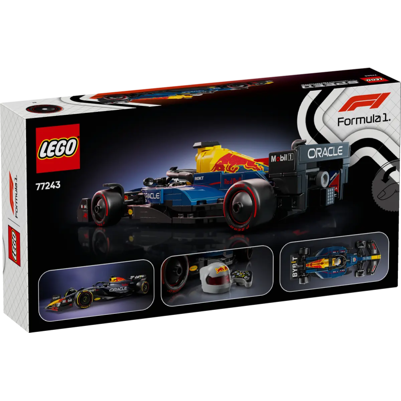 Das Modell des F1-Rennautos hat ein Cockpit, das sich mithilfe des Halo-Bügels hochklappen lässt, einen Heckflügel, einen Querlenker, Sponsorenaufkleber und breitere Hinterreifen mit dem Aufdruck „Pirelli“. Zum Set gehört auch ein Rennfahrer im Red Bull-Rennoverall mit Helm. Die Minifigur kann fürs Rennen ins Cockpit gesetzt werden.
