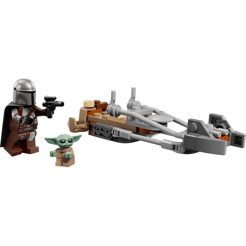 - SPEEDER BIKE: Befestige das Blastergewehr des Mandalorianers am Heck des Speeder Bikes, setz die Minifigur auf den Fahrersitz und steck Grogu in die Satteltasche an der Seite