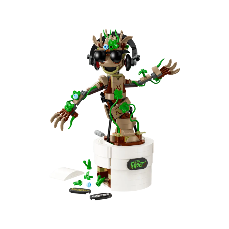 - Tanzender Superheld: Das Spielset beinhaltet einen baubaren Groot in einem Blumentopf, 3 verschiedene Namensschilder, die am Topf befestigt werden können, sowie diverse Accessoires (zusätzliche Blätter, Kopfhörer, Sonnenbrille)