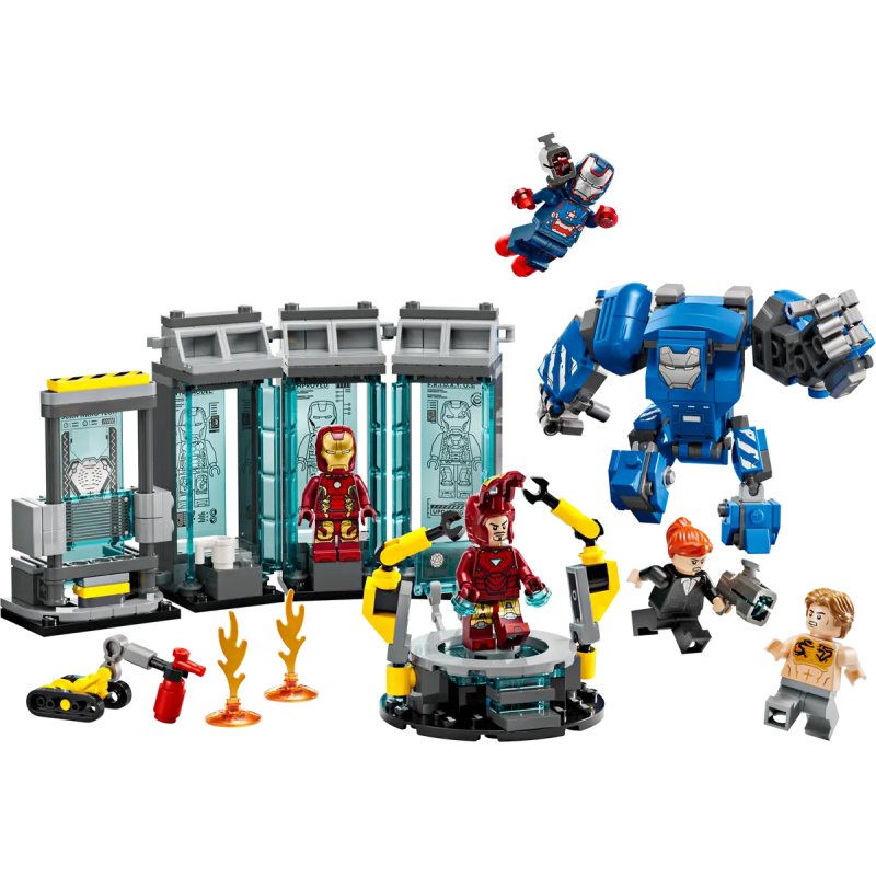 - Action-Abenteuer mit Iron Man: In dem Labor befinden sich 3 Kabinen mit Rüstungen, eine Wartungsplattform mit 2 Roboterarmen, ein großer Scanner und 2 Shooter für riesigen Actionspaß