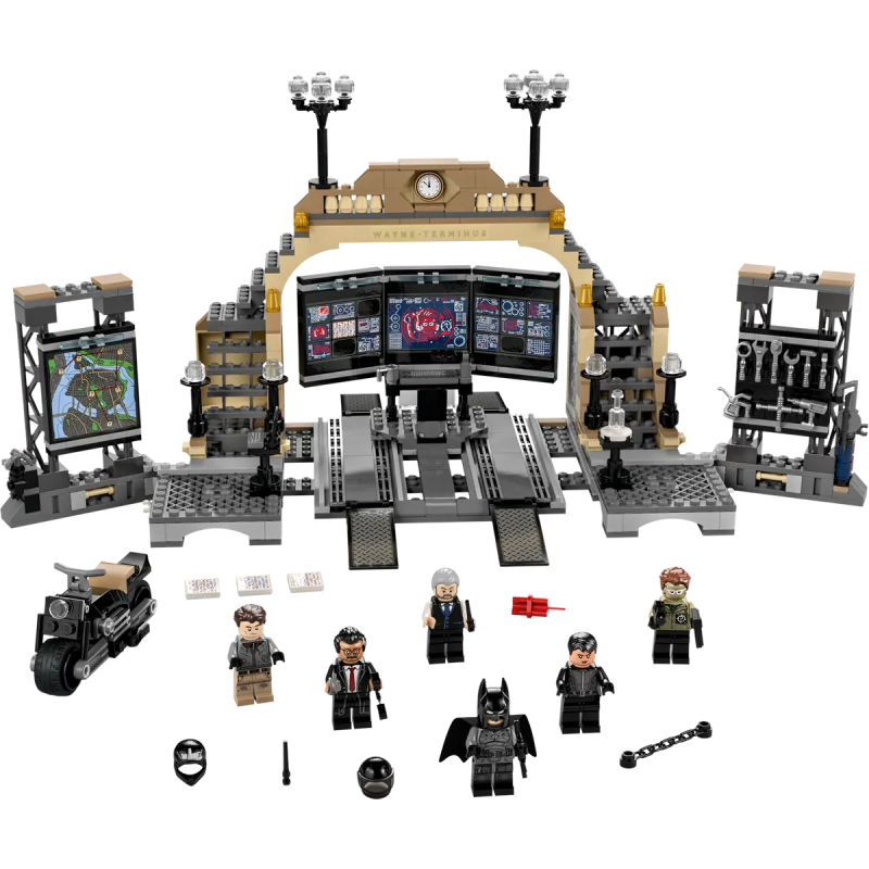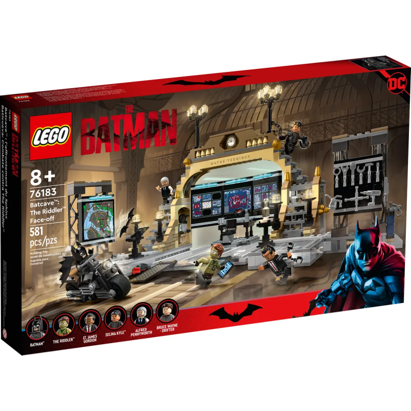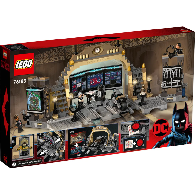 Die Bathöhle ist mit Computern, Werkzeug und Schweißgeräten für Fahrzeugreparaturen ausgestattet. An einer Seitenwand hängt eine Karte von GOTHAM CITY™, an der anderen ein Werkzeuggestell. Beide Wände lassen sich an Scharnieren wegklappen, um mehr Platz zum Spielen zu haben. Das Set beinhaltet 6 Minifiguren aus dem Film „The Batman“: Batman, Selina Kyle™, Riddler, Drifter, Alfred und Commissioner Gordon. Auf 3 Elementen hat Riddler geheime Botschaften hinterlassen, die man nur mit der Speziallupe lesen kann, um Hinweise zu erhalten. Wenn Batman auf seinem Motorrad losfährt, kann er sich als Drifter verkleiden. Falls er mit Schurken im Gepäck zurückkehrt, kann er die Bösewichte ins Gefängnis der Bathöhle stecken. Das Batmobile™ aus dem Spielset „Batmobile: Verfolgung des Pinguins™“ (76181) kann zur Reparatur auf die Rampe gefahren werden. Das Batmobile ist nicht enthalten.