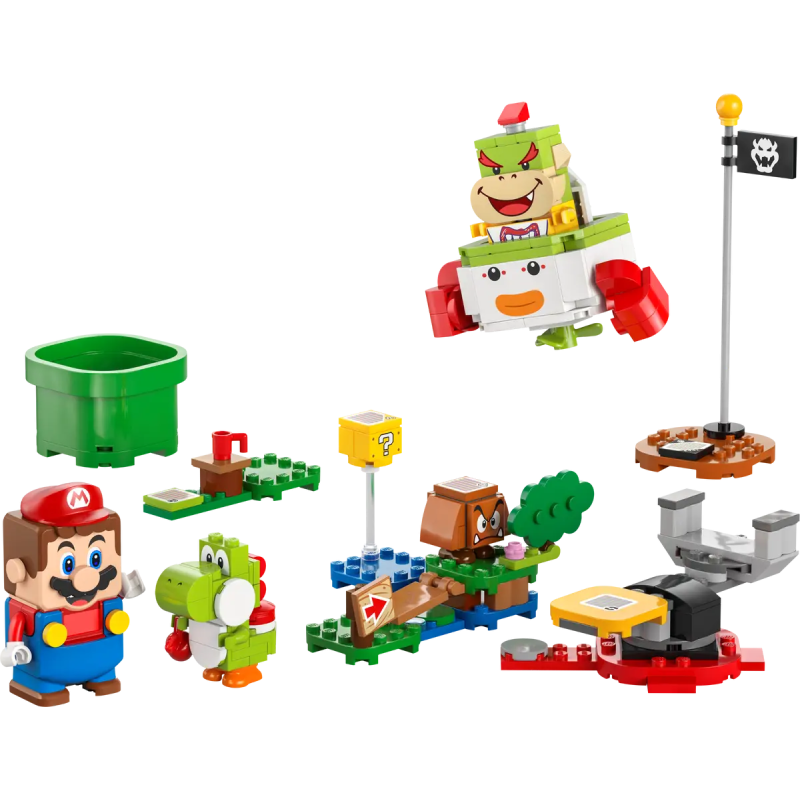 - Abenteuer-Spielset: Geh an der Röhre los, grüße Yoshi, besiege einen Gumba, stampfe auf den ?-Block, nimm es mit Bowser Jr. auf und erreiche den Zielpfahl