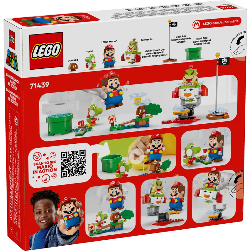 Dieses LEGO® Super Mario™ Spielset (71439) lässt Kinder viele Abenteuer mit dem interaktiven LEGO Mario darstellen, der versuchen kann, Bowser Jr. die Junior-Clown-Kutsche abzunehmen. Das Set beinhaltet neben dem interaktiven LEGO Mario auch die Spielzeugfiguren Bowser Jr., einen Gumba und Yoshi sowie 3 Landschaftsmodelle und ist ein tolles Nintendo® Geschenk für Jungen, Mädchen und Gamer ab 6 Jahren. Begib dich von der Röhre zum Zielpfahl und lass LEGO Mario unterwegs digitale Reaktionen zeigen und Münzen sammeln. Grüße Yoshi, besiege den Gumba, stampfe auf den ?-Block, stoße Bowser Jr. um und fahr mit seiner Junior-Clown-Kutsche davon.